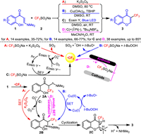In 2022, Behera et al. successfully employed a Cu(OAc)2/TBHP catalytic system to achieve the same transformation for the synthesis of 3-trifluoromethyl chromones 3 (Scheme 2B) [56]. Notably, the reaction also proceeds through a radical and imide cation process. This transformation differs from what we reported, as it involves the generation of an electrophilic trifluoromethyl radical through the oxidation of CF3SO2Na by TBHP, with the radical intermediate 2A undergoing single-electron oxidation by copper(Ⅱ) to form the iminium intermediate 2B (Scheme 2B).