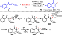 In 2020, Yang and cowokers employed Selectfluor 66 as an electrophilic fluorination reagent to synthesize 3-fluorochromones 72 via BHT (butylated hydroxytoluene) coordination (Scheme 36) [112]. Based on mechanistic studies, the authors proposed a novel reaction mechanism, as depicted in Scheme 36, the process begins with the nucleophilic substitution of enaminone 1 by Selectfluor 71, yielding intermediate 36A. This intermediate undergoes a second nucleophilic substitution with Selectfluor to form the difluorinated intermediate 36C via intermediate 36B. Assisted by NaOAc, intermediate 36C then undergoes rapid intramolecular nucleophilic cyclization to produce intermediate 36D. Finally, intermediate 36D undergoes defluorination and deamination, facilitated by BHT, to form the desired product 72.
