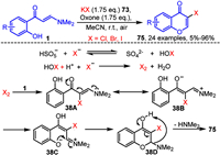 | Scheme 38. Oxone-mediated synthesis of 3-halochromones. | |