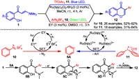In 2020, Mkrtchyan and Iaroshenko developed two distinct strategies for synthesizing 3-arylated chromones 12 utilizing aryldiazonium tetrafluoroborates 10 and diaryliodonium triflates 11 as arylation reagents (Scheme 5) [61]. These methods employed a visible light-mediated tandem arylation-cyclization reaction of o-hydroxyaryl enaminones 1. Initially, the photosensitizers Eosin Y and Ru(Ⅱ) were excited to their respective excited states under suitable light irradiation. Subsequently, arylation reagents 10 and 11 were reduced by the excited states EY* and Ru(Ⅱ)*, generating aryl radicals 5A. These aryl radicals then underwent electrophilic addition to the enaminones 1, forming the intermediate 5B, which was further oxidized to produce 5C. Finally, 5C underwent intramolecular nucleophilic cyclization to form 5D, followed by the elimination of a dimethylamine cation to produce the desired 3-arylated chromones 12.