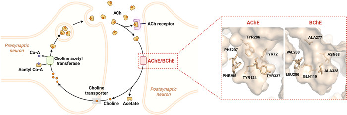 | Fig. 1. Schematic diagram of ACh generation and degradation at the synaptic junction, and comparison of active pockets between hAChE (PDB ID: 4EY4) and hBChE (PDB ID: 6QAA). Proteins appear light brown and six residues related to the size of the active gorge are shown in wheat. Created with BioRender.com. | |