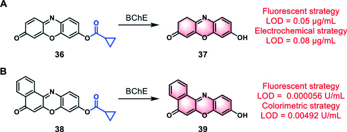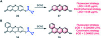 | Fig. 11. (A) Structure of the dual-mode probe 36 and its fluorescence generation mechanism. The red characters are the LOD for BChE measured by fluorescent and electrochemical methods. (B) Structure and fluorescence generation mechanism of dual-mode probe 38. The red characters are the LOD for BChE measured by the fluorescent and colorimetric methods. | |