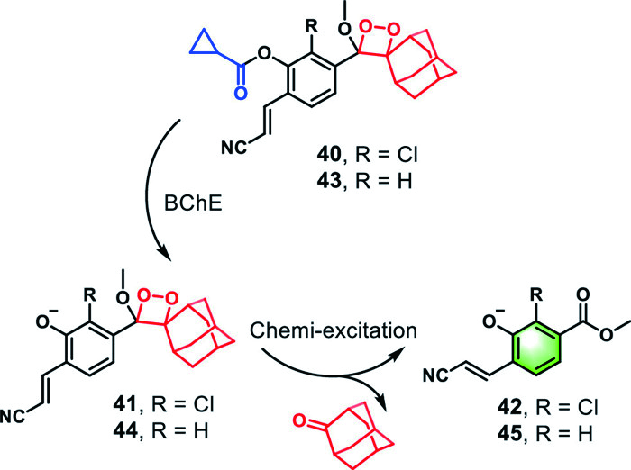 Distinct from the approach above, Acari et al. designed the first chemiluminescent probe 40 for specifically targeting BChE, taking into account the advantages of chemiluminescent probes with high sensitivity, high signal-to-noise ratio, and no need for external light excitation, and they [100]. Chemiluminescence arises from the chemical reaction process in which a substance in an excited state returns to its ground state. It does not require photon absorption, thus avoiding the drawbacks of photobleaching, light scattering, and autofluorescence associated with fluorescent probes [101,102]. Probe 40 underwent BChE-mediated hydrolysis to yield an unstable phenolic-dioxirane (41), which subsequently decomposed into the excited intermediate benzoate ester (42) and adamantanone through a chemiexcitation process to produce. The excited-state benzoate derivative transitioned to the ground state by emitting photons, resulting in the generation of bright chemiluminescence (Fig. 12) [100]. With good biocompatibility and chemical stability, probe 40 could not only detect BChE in different cellular environments like HEK293T, HepG2, and SH-SY5Y cells, but also localized to the liver in healthy mice and tumor tissue in SY5Y tumor-bearing mice.