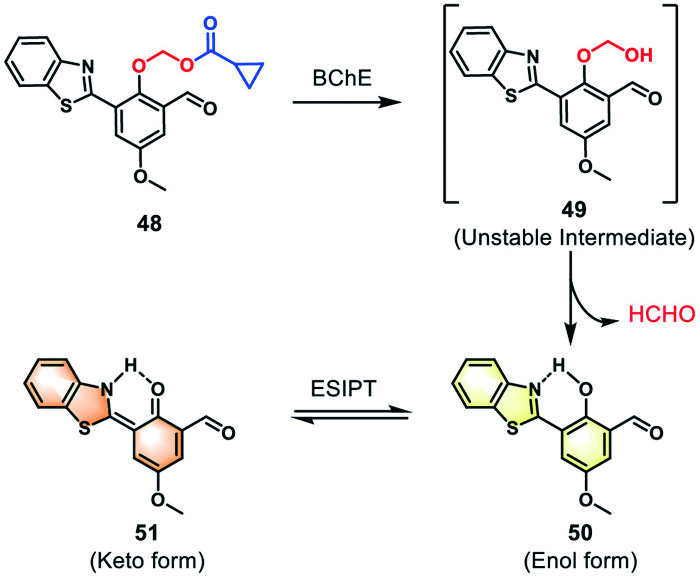 In 2023, Chen et al. reported a BChE fluorescent probe 48 with both AIEE and ESIPT effects on the basis of the HBT framework, which enabled precise imaging of HeLa cells and livers in zebrafish NAFLD model (Fig. 14) [127]. Compound 48 underwent BChE-mediated ester bond cleavage and spontaneous formaldehyde release to enol form (50) with the weakly yellow fluorescent at 527 nm, which then isomerized through the ESIPT process to keto form (51) with the intensely orange fluorescent at 614 nm. The increase in system hydrophilicity was accompanied by a decrease in enol emission and an enhancement of the keto signal. Probe 48 emitted a ratio fluorescence intensity in a mixed system of tetrahydrofuran and water (5:95 ratio) that exceeded 200 times that in pure tetrahydrofuran, which was conducive to its application in aqueous solutions.