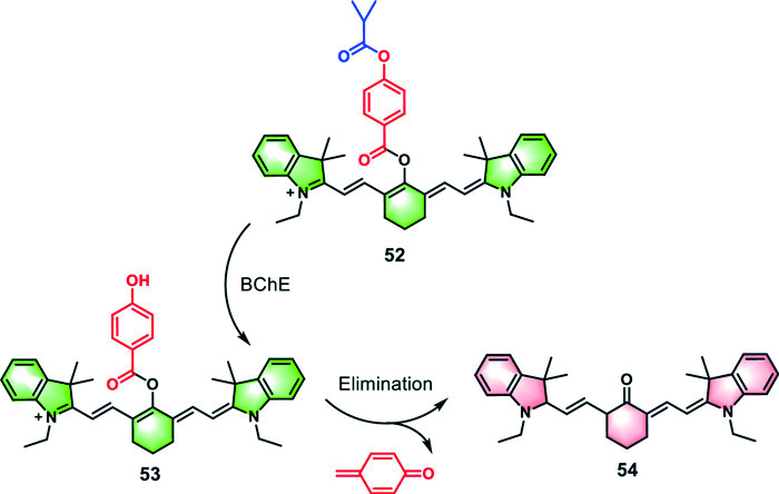 What is more, the signal generation of the NIR ratiometric fluorescent probe 52 designed by Ding et al. in 2023 relies not only on the enzyme-catalyzed reaction mediated by BChE but also on the subsequent 1,6-elimination reaction (Fig. 15) [128]. After the catalytic reaction was triggered by BChE, the fluorescence signal emitted by probe 52 intensified at 637 nm and weakened at 816 nm. The color of the solution also changed significantly from green to red, which could be observed by the naked eye. In the RAW264.7 cell line overexpressing BChE, the red fluorescence signal of the probe was significantly enhanced, while the NIR fluorescence signal (green fluorescence) was relatively weaker. However, the opposite trend was observed in HeLa cells and B16 cells with relatively low BChE expression levels, revealing the crucial role of BChE in the probe activation process. It was worth mentioning that this innovative sensing system not only could identify BChE in mouse brain tissue slices accurately, but also showed potential applications in detecting pesticide residues in agricultural products.