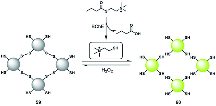 In 2018, Qian et al. first designed a redox-regulated fluorescent nanoswitch 59 based on reversible disulfide bonds, serving as one of the new means for BChE fluorescence detection (Fig. 17) [130]. The disulfide bonds in polymer 59 were sensitive to thiols, and in the presence of thiols, they underwent decomposition triggered by thiols to generate thiol-functionalized carbon quantum dots (thiol-CQDs) with strong fluorescence. Oxidant H2O2 induced the exposed sulfhydryl group on the surface of thiol-CQDs to connect into disulfide bond components, resulting in fluorescence quenching. The nanoswitch 59 was used to measure the BChE activity in serum samples from three healthy individuals, and the obtained data was close to the results measured by the Ellman method, suggesting the credibility of this detection method. This approach has a certain universality, as when the substrate is replaced with acetylthiocholine, it could also quantitatively measure the activity of AChE.