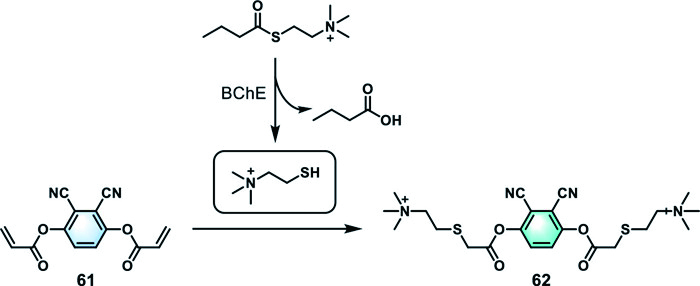 Utilizing the principle of thiol-click reaction, the same team further designed a fluorescent probe 61 that was sensitive to thiocholine in 2019 [131]. Probe 61 itself had a faint blue fluorescence, while the introduction of thiocholine reduced a rapid thiol-click reaction to produce highly fluorescent thioether, resulting in a sharp increase in fluorescence signal at 460 nm, thus indirectly reflecting BChE activity (Fig. 18). Within the BChE concentration range of 0.2–9.0 U/mL, the fluorescence signal of the probe 61 presented a highly positive linear relationship with the protein concentration (R2 = 0.997). Unexpectedly, the nonspecific response of the probe to glutathione (GSH) caused micromolar levels of GSH in normal human plasma to affect the detection accuracy. Therefore, during detection, it was advisable first to add probe 61 to the sample and then introduce thiocholine after the GSH depletion to minimize the impact of GSH.
