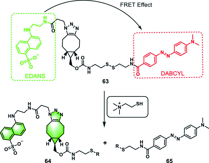 In 2020, Gong et al. employed the principles of bioorthogonal copper-free strain-promoted azide-alkyne cycloaddition (SPAAC) reaction to react a disulfide-containing bicyclononyne with an EDANS derivative, followed by a reaction with DABCYL, successfully synthesizing a FRET probe 63 with "turn-on" fluorescence (Fig. 19). This probe was designed to specifically and quantitatively detect the activity of BChE in serum in the presence of GSH [141]. Probe 63 could make a response to thiols rapidly, and EDANS fluorescence was induced by molecules containing sulfhydryl groups except GSH. Similarly, thiocholine could react with probe 63, which was resistant to the interference of GSH at concentrations up to 50 µmol/L or even 50 mmol/L. It was also applied to determine BChE activity in healthy human plasma samples with physiological GSH concentrations, yielding an average activity of 7460 ± 597 U/L, which fell within the normal range of BChE.
