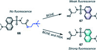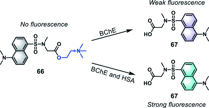 To eliminate the interference from the non-specific binding of various components in human serum samples, particularly the high content of human serum albumin (HSA), Han's team in 2019 innovatively integrated HSA into a fluorescent sensing system, and successfully developed the fluorescent probe 66 with a high affinity for HSA by utilizing choline to block the carboxyl group of the fluorescent moiety dansyl-l-sarcosine (DS) (Fig. 20) [156]. The carboxyl group of DS could form stable hydrogen bonds with two residues in HSA, Lys414A and Ser489A, leading to a dramatic increase in fluorescence intensity. Caging of the fluorophore weakened the binding affinity and fluorescence intensity which was reversed under the enzymatic catalysis of BChE. The probe 66 remained inactive when only HSA or BChE was present, but released fluorescence when HSA and BChE coexisted. Probe 66 could also effectively quantify BChE activity in human serum, and the detection result (5.723 ± 0.0014 U/mL) was basically consistent with the traditional Ellman method (5.720 ± 0.0085 U/mL).