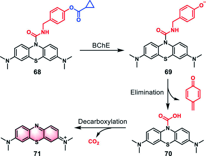 | Fig. 21. Structure of dual-responsive probe 68 and its fluorescence generation mechanism. | |