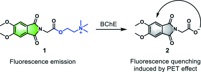 In 2016, Han et al. ingeniously employed 4,5-dimethoxyphthalimide to label choline and successfully designed a BChE-responsive probe 1 with the unique "turn-off" effect [69]. When exposed to excitation light with a wavelength of 355 nm, probe 1 emitted a robust green fluorescence at 520 nm. Following enzymatic hydrolysis of ester bonds by BChE, this molecule converted into N-carboxylated 4,5-dimethoxyphthalimide derivatives, triggering the intramolecular photoinduced electron transfer (PET) quenching under physiological pH conditions (Fig. 4). This phenomenon led to a rapid quenching of the original fluorescence and the whole system showed a noticeable fluorescence shutdown effect. Probe 1 had also been successfully used to evaluate the inhibitory effect of the ChEs inhibitors tacrine and galantamine. The detection system exhibited visible color changes during testing, making this probe a promising candidate as a tool molecule for the visual high-throughput screening of BChE inhibitors.
