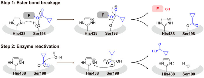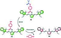 | Fig. 5. The mechanism of fluorescence signal generation in a probe induced by BChE-mediated cleavage of an ester bond. His438 and Ser198 are key residues in the catalytic triad of BChE. | |