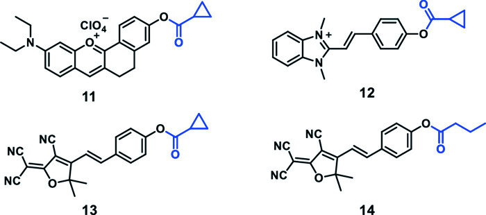 In the same year, Liu's group designed the fluorescent molecule 13 using 2-dicyanomethyldiene-3-cyano-2,5-dihydrofuran as the fluorophore, and cyclopropyl as the BChE recognition moiety. It had good reaction sensitivity and could rapidly recognize the target for 7 min [79]. Good membrane permeability and biocompatibility enabled probe 13 to track BChE in HepG2 cells and HEK293T cells in real time, and identify BChE in the liver and brain of healthy mice. Additionally, researchers developed another probe 14 bearing the butyryl group and found that its performance was similar to probe 13 in vitro, but did not explore the in vivo imaging capabilities in depth.
