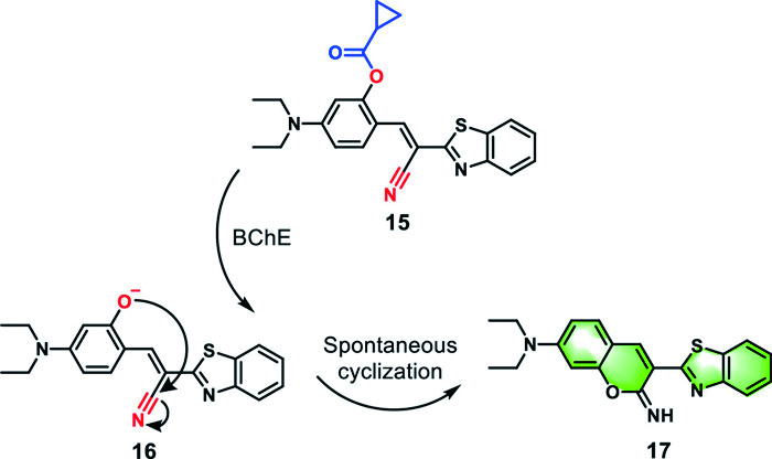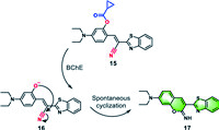 Similarly, Ding et al. designed probe 15 with no background interference and a high signal-to-noise ratio by coupling the BChE-specific recognition element with a spontaneous cyclization fragment (Fig. 8) [80]. BChE released the oxygen anion by catalyzing ester bond hydrolysis in probe 15, and subsequently, oxyanion attacked the cyano group to trigger an in situ cyclization reaction concomitantly, ultimately leading to fluorescence generation. Probe 15 could not only effectively recognize BChE in HEK293, HeLa, and HepG2 cells, but also had the potential to localize cytoplasm precisely. When incubated with cells for 30 min using a concentration of 5 µmol/L probe 15, fresh mouse brain slices exhibited bright green fluorescence. Interestingly, it could also respond to OP and carbamate pesticides, providing broad prospects for its application in food safety, especially in the detection of trace pesticides.