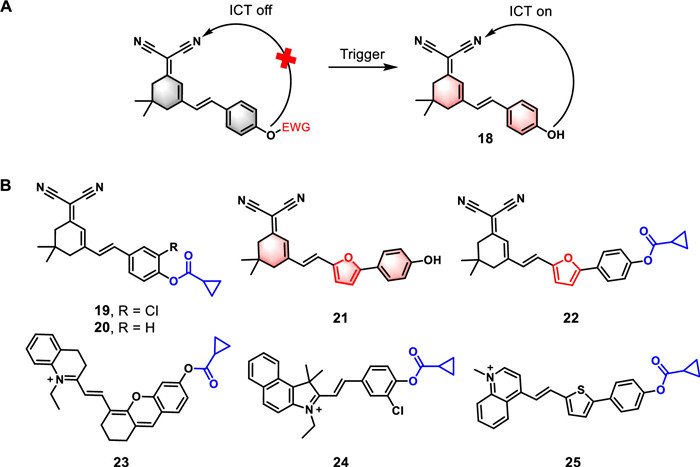 Based on its intramolecular charge transfer (ICT) process of the donor-π-acceptor (D-π-A) structure, long fluorescence emission wavelength, large Stokes shift and good photostability, the dicyanoisophorone (DCI) fragment is considered to be the classic fluorophore for constructing NIR fluorescent probes [81,82]. The introduction of an electron-withdrawing group (EWG) to the hydroxyl group of DCI-OH (18) will increase the energy gap between its highest occupied molecular orbital (HOMO) and the lowest unoccupied molecular orbital (LUMO), thereby preventing electron transitions and subsequently causing fluorescence quenching [83,84]. When the EWG is triggered to depart, the previously blocked ICT process is restored. At this point, electrons transfer from the donor group (hydroxyl group) to the acceptor group (cyano group), and this process promotes the regeneration of the fluorescent signal (Fig. 9A) [85,86].