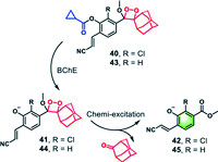 | Fig. 12. Structures of probes 40 and 43 with the corresponding fluorescence generation mechanism. | |