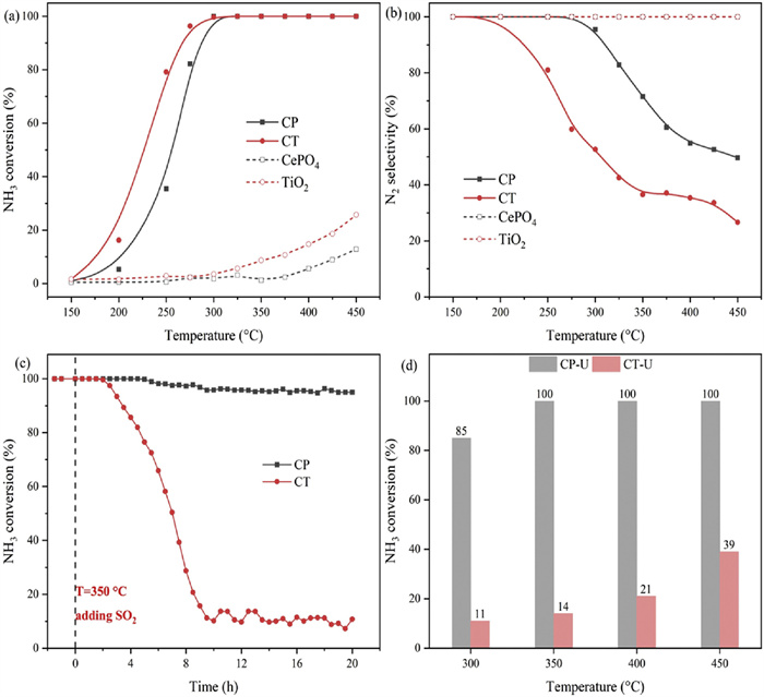 Furthermore, TiO2 supported Cr sample was served as the contrasted catalyst. Particularly, the SCO performances of the Cr/CePO4 catalysts with varying Cr ratios were shown in Fig. S1 (Supporting information), where a doping ratio of 10 wt% for Cr was identified as optimal. The NH3-SCO performances and long-term stability in the presence of SO2 over Cr/CePO4 and Cr/TiO2 were conducted. Subsequently, reaction process and physiochemical properties had been evaluated by a range of analytical techniques, including X-ray diffraction (XRD), scanning electron microscopy (SEM), transmission electron microscopy (TEM), temperature program reductions, in-situ diffuse reflection infrared Fourier transform spectroscopy (DRIFTs) Notably, TiO2 or CePO4 supported Cr catalysts were denoted as CT or CP respectively, while CT-U or CP-U represented the two catalysts after 20 h stability tests in the presence of SO2.