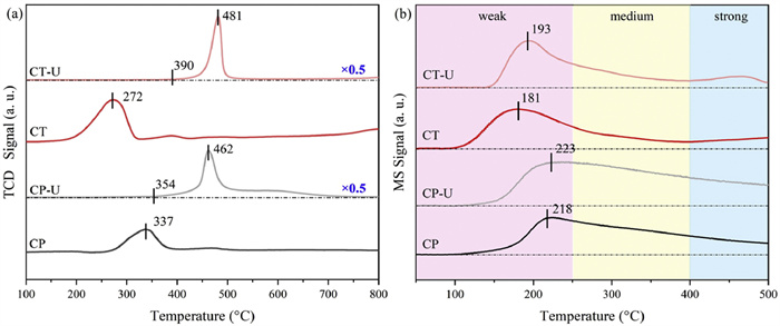 Moreover, from previous works [32, 33], the desorption peaks of NH3 could be divided into three sections within 50–250, 250–400 and 400–500 ℃, corresponding to NH3 desorbed from weak, moderate and strong acidic sites, respectively. As such, NH3-TPD profiles in Fig. 2b indicated that more strong acidic sites existed on CP sample compared with CT catalyst, as CP sample possessed much bigger area of NH3 desorption peaks within medium-high temperature range. Furthermore, after stability tests, surface acidity of CT-U and CP-U samples obviously enhanced compared with their respective fresh sample, which should be the electron-withdrawing effect of sulfate species deposited on catalysts [34]. And the above findings could be the reasons of promoted N2 selectivity of samples after stability tests.