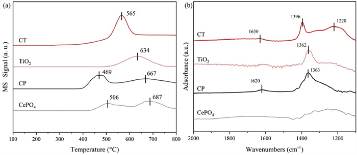 | Fig. 3. SO2-TPD (a) and DRIFT spectra of SO2+O2 co-adsorption (b) over various samples. | |