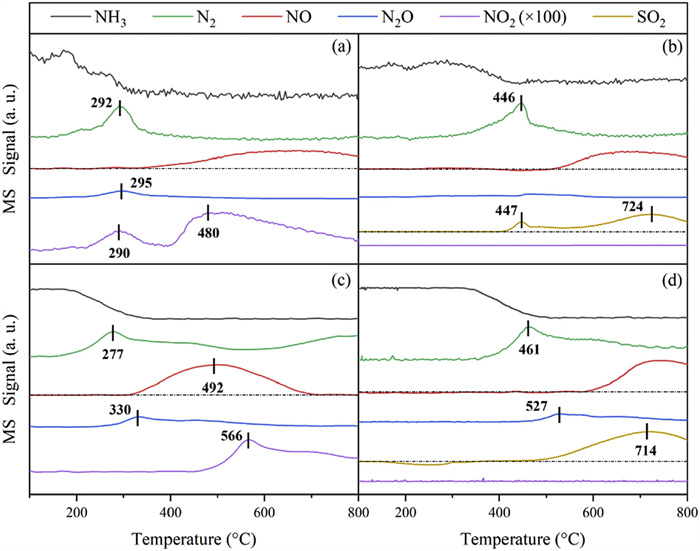 Nowadays, air pollution problems, including PM2.5 and O3, have become increasingly urgent environmental challenges [1], where NOx and NH3 from stationary sources indispensably contributed to that [2]. Originally, to control emissions of NOx from stationary sources, selective catalytic reduction (SCR) of NOx with ammonia (NH3-SCR) has been widely applied [3-8]. However, owing to fluctuation of gaseous distribution and operational condition, over stoichiometric ratio of NH3 had been injected to ensure deNOx efficiency during SCR process, consequently resulting in emissions of unreacted NH3 and some NOx to atmosphere [9, 10]. To solve above contradictory situation, one promising way is to establish NH3-SCO (selective catalytic oxidation of NH3) catalysts at the tail-end of SCR units, which could selectively convert unreacted NH3 to N2 and H2O [11]. Lately, noble metal and transition metal-based catalysts with suitable redox ability, which could balance the deep dehydrogenation and over-oxidation of NH3, had been developed to apply in NH3-SCO reaction [12-15]. However, SCO performances of above NH3-SCO catalysts would be significantly affected by SO2 in flue gases [9, 16], which was due to the natural affinity between SO2 and active sites in SCO catalysts, consequently resulting in pronounced decrease in SCO activity and a shortened catalyst lifespan. Recently, research about promoting sulfur tolerance of catalysts had been widely studied in NH3-SCR reactions [17-19], while conquering the problem in NH3-SCO field still had long way to go as the existed SO2 would easily form ammonium sulfates with the reactant NH3 and seriously deactivate active sites on catalysts [15].
