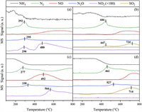 | Fig. 4. NH3+O2-TPSR profiles of various samples: CP (a), CP-U (b), CT (c) and CT-U (d). | |