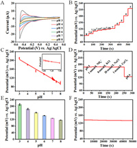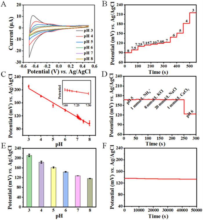 | Fig. 2. (A) CVs of the TOA/GCE in the pH range of 3–8 with a scan rate of 50 mV/s. (B) The OCPT and (C) calibration curve of the TOA/GCE in the pH range from pH 3 to 8. (D) The selectivity of the TOA/GCE in 0.1 mmol/L phosphate buffer solution (PBS) with 1 mmol/L NH4+, 8 mmol/L KCl, 20 mmol/L NaCl, and 1 mmol/L CaCl2. (E) The repeatability of the TOA/GCE during three cycles for pH range of 3–8. (F) The operating stability of the TOA/GCE in 0.1 mol/L PBS (pH 6). | |
