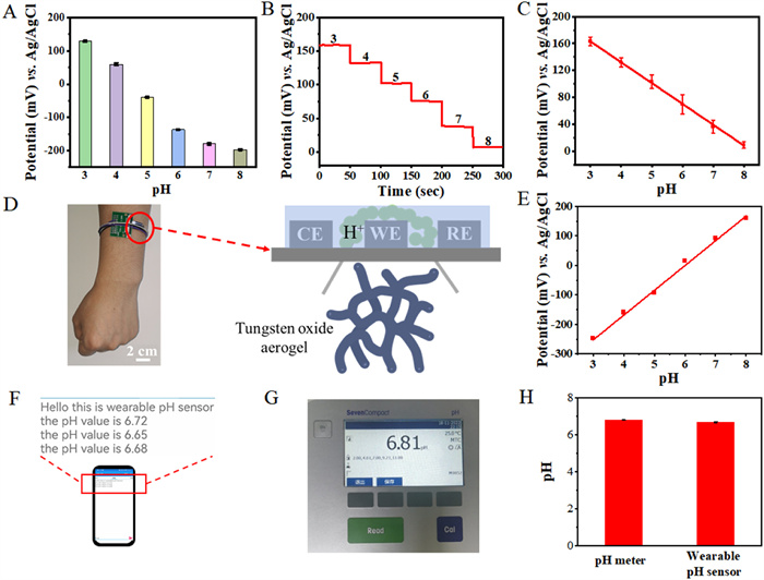 As we known, the pH value is an important clinical pathological parameter which can provide the early monitoring for human body injuries [25-28]. Meanwhile, metal oxides, especially nanostructured tungsten oxide (TO), have been widely used as a pH-sensitive layer due to their chemical activity and stability, low cost, biocompatibility, and high selectivity against common interfering ions [29, 30]. Herein, in this work, a TO aerogel (TOA) synthesized by a hydrothermal method was successfully applied to construct a sensitive and stable wearable pH sensor. The continuous metal oxide framework in the TOA can accelerate the mass transfer diffusion and electron transfer, ensuring high sensing performance. The developed wearable pH sensor exhibited high sensitivity, good selectivity and reproducibility, and superior stability in the range of 3–8. When used for non-invasive and real-time pH monitoring on human skin, the very small relative deviation (1.91%) from the results of the commercial pH meter verified the reliability of the as-fabricated wearable pH sensor in practical application. Furthermore, the wearable pH sensor displayed an outstanding shock-resistance (118.38 kPa) with negligible influence on the sensitivity, primarily due to the self-supported architectures and flexibility of the TOA.