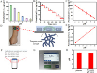 | Fig. 3. (A) The repeatability of the TOA/SPE in 0.1 mol/L PBS. (B) The OCPT curves and (C) the corresponding calibration curve of the TOA/SPE in the artificial sweat. Wearable pH sensor: (D) the schematic illustration of the application experiment, (E) the calibration curve measured in the artificial sweat by the signal amplifier circuit, (F) the real-time pH monitoring via a mobile phone, (G) the pH value measured via a commercial pH meter, and (H) the comparison of the results of the TOA-based wearable sensor with a commercial pH meter. | |