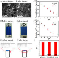 | Fig. 4. (A, B) The SEM images of the TOA and (C) the corresponding calibration curves of the TOA/GCE before and after the impact. (D, E) The optical photos of the sensing chips and (F) their corresponding calibration curves before and after the impact. pH monitoring of the artificial sweat by the wearable sensor (G) before and (H) after the impact, and (I) the comparison of the results with a commercial pH meter. | |