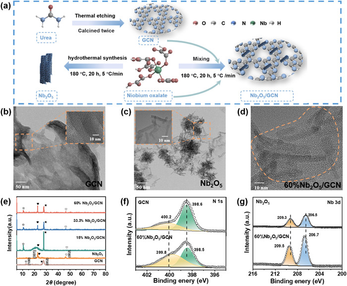 | Fig. 1. (a) Catalyst synthesis strategy and (b-d) HRTEM images of GCN, Nb2O5, and 60%Nb2O5/GCN photocatalyst. (e) XRD patterns of GCN, Nb2O5, and xNb2O5/GCN (x = 15%, 33.3%, and 60%). High-resolution XPS spectra of (f) N 1s for GCN and 60%Nb2O5/GCN photocatalyst, (g) Nb 3d for Nb2O5 and 60%Nb2O5/GCN photocatalyst. | |