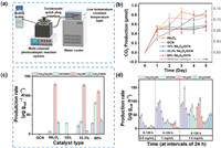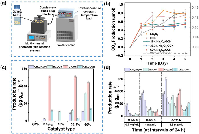 | Fig. 3. (a) Photocatalytic device, (b) CO2 production kinetics, (c) production rate of acids and alcohols during PBAT MPs photodegradation as a function of photocatalyst types (catalyst concentration is 0.5 mg/mL, MPs concentration is 1.5 mg/mL), and (d) initial concentrations of MPs by 0.5 mg/mL 60%Nb2O5/GCN photocatalyst after 5-day visible light irradiation at an intensity of 100 mW/cm2. | |