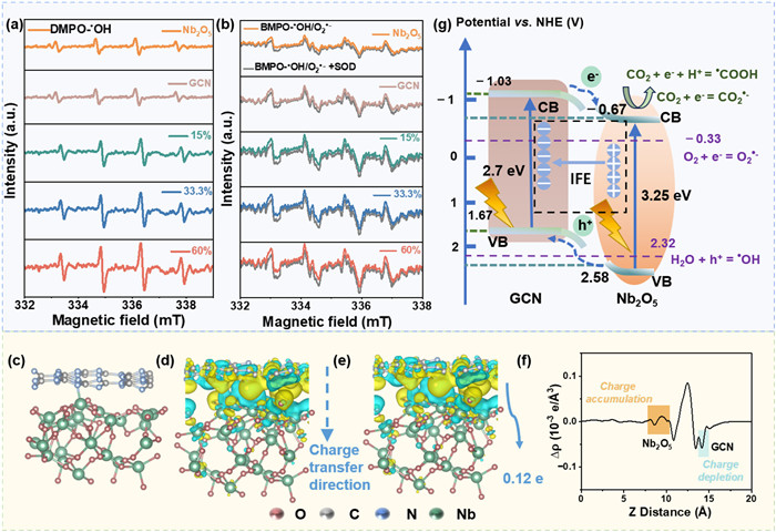 | Fig. 4. ESR spectra recorded at ambient temperature for the (a) DMPO-•OH, (b) BMPO-•OH/O2•−, BMPO-•OH/O2•−+SOD spin adduct within the GCN, 15%Nb2O5/GCN, 33.3%Nb2O5/GCN, 60%Nb2O5/GCN catalysts under LED lamp irradiation, (c) DFT-optimized structures, (d) three-dimensional charge density difference, (e) Bader electron transfer from Nb2O5 to GCN, (f) plane-averaged charge density difference ∆ρ(z) along the z-Axis for heterostructures composed with GCN and Nb2O5 and (g) electron transfer path of Nb2O5/GCN heterojunction catalyst. | |