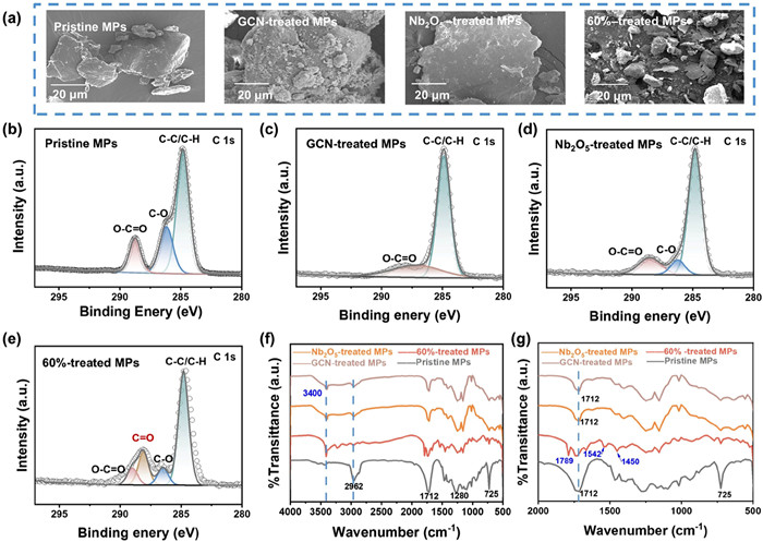 | Fig. 5. (a) SEM images of PBAT microparticles before and after 120 h degradation with GCN, Nb2O5, and 60%Nb2O5/GCN heterojunction photocatalyst. High-resolution C 1s analysis of (b) pristine PBAT MPs and after photocatalytic degradation using (c) GCN, (d) Nb2O5, (e) 60%Nb2O5/GCN, and FTIR analysis of pristine PBAT MPs and photocatalyst-treated MPs at (f) 4000–500 cm−1 and (g) 2000–500 cm−1 for 120 h. | |