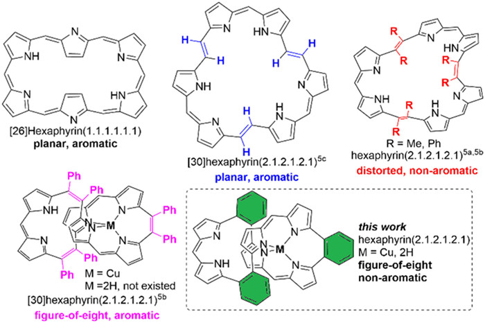 In this context, we focused on C2 (two carbons linkage) methine-bridged hexaphyrins(2.1.2.1.2.1) and their complexes to discover novel molecular geometries, aromaticity, and optical and electronic properties. From 2019, Yamada group and we have developed diphenylvinylene-/dimethylvinylene-/vinylene-bridged hexaphyrins(2.1.2.1.2.1) (Fig. 1) [15-17]. Among these, C2 methine-bridged hexaphyrin(2.1.2.1.2.1) [15], diphenyl-vinylene bridged hexaphyrin(2.1.2.1.2.1) copper complexes [16], have aromatic figure-of-eight Hückel topologies, vinylene bridged hexaphyrin(2.1.2.1.2.1) [17] with planar aromatic topologies. The figure-of-eight vinylene-bridged hexaphyrins(2.1.2.1.2.1) free base has not yet been obtained (Fig. 1), and the demetalization of diphenyl-vinylene-bridged hexaphyrin(2.1.2.1.2.1) copper complexes gave a twisted conformation similar to that of the diphenyl-vinylene-bridged hexaphyrin(2.1.2.1.2.1) free base [16, 18-20]. The fusion of aromatic units, such as benzo, can potentially increase the π-conjugation of expanded porphyrins [21]. The extended fusion of benzo unit acts as contributors where the Clar's sextet [22, 23] shifts from one side to another, with enough power to interfere with the electronic structure and global aromaticity [21]. Increased π-conjugation also results in rich aromaticity and NIR optical properties [1-3, 9-14]. However, the fusion of the benzo units in hexaphyrins has not yet been reported.