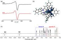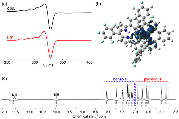 | Fig. 2. (a) Experimental (black) and simulated (red) ESR spectra of HexCu. (b) spin density distribution for HexCu at an isovalue of 0.0004. (c) 1H NMR spectrum of Hex in CDCl3, 298 K. | |