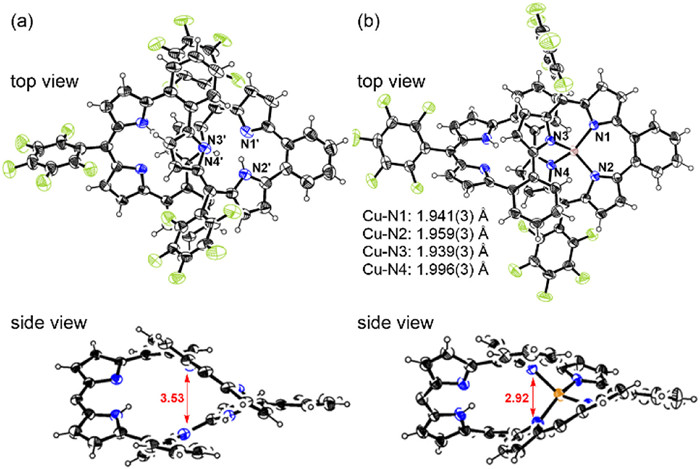 | Fig. 3. Single crystal structures of (a) Hex and (b) HexCu with selected bond distances (Å). Thermal ellipsoids are shown at 40% probability. Aryl groups in side view have been omitted for clarity. | |