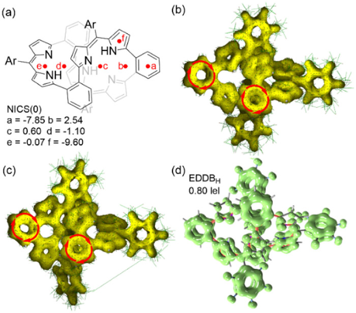 | Fig. 4. (a) NICS(0) values calculated in points a–f of Hex, aryl groups at meso-positions are omitted for clarity. (b, c) ACID plots (isovalue = 0.03) of Hex and HexCu. (d) Isovalue contours of the global EDDBp(r) function of Hex determined for the Vogel's bridged-annulene pathway (marked red); the electron populations refer to the EDDB-based averaged atomic contributions to global (EDDBH). | |