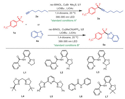 Herein, we report a unique approach to realize the first case of Sonogashira-type cross-coupling of trifluoromethylarenes (ArCF3) with terminal alkynes C(sp)-H bonds via photoredox and copper dual catalysis. In addition, the catalytic system is also suitable for cross-coupling of trifluoromethylarenes (ArCF3) with azoles C(sp2)-H bonds. A series of α,α-difluorobenzyl-alkyne and α,α-difluorobenzyl-azole compounds can be synthesized via this approach (Scheme 1b). Key to success are tridentate anionic ligands with a suitable skeleton. Interestingly, although it is known that BINOL often acts as a ligand in many copper-catalyzed systems [57-59], we discovered BINOL plays a crucial role in this catalytic system as a photocatalyst to activate trifluoromethylarenes rather than a ligand. Coincidentally, a recent study from Yu’s group also used deprotonated BINOL derivatives as a photocatalyst [60]. This new catalytic system features mild conditions, wide substrate scope and good functional group compatibility and also provides a new strategy for C(sp3)-F bonds functionalization.
