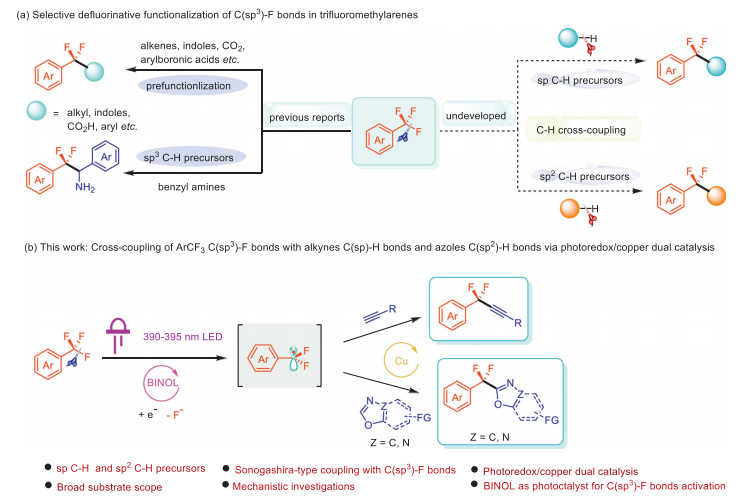 Over the past decade, several effective strategies have been developed for the functionalization of the C(sp3)-F bonds of trifluoromethylarenes (Scheme 1a) [15-24]. Particularly, the generation of α,α-difluorobenzylic radical by visible light-induced single electron transfer has become an elegant method to trigger the functionalization of C(sp3)-F bonds in trifluoromethylarenes under mild conditions [25-36]. For example, radical addition type reactions induced by photosensitizers for defluorination of trifluoromethylarenes have been reported by Jui and other groups [25-27,29,30,34-36]. In addition, visible light-induced radical defluorohydrogenation [32] and defluorocarboxylation [28] reactions have also been achieved successively. Owing to the unique advantages of transition metals in catalyzing radical cross-coupling reactions [37-39], as a matter of course, this powerful tool has been applied to the functionalization of C(sp3)-F bonds [31,40,41], such as defluoroarylation [31] and defluoroamination [40] have also been achieved. However, these approaches rely on prefunctionilization of the coupling partners, and using C–H precursors without prefunctionlization is considered as an ideal approach. In 2023, Mratin’s group reported a defluoroalkylation of trifluoromethylarenes with benzylic C(sp3)-H bonds of benzyl amines [19]. However, cross-coupling of ArCF3 with C(sp)-H bonds precursors and C(sp2)-H bonds precursors have been rarely reported up to now.