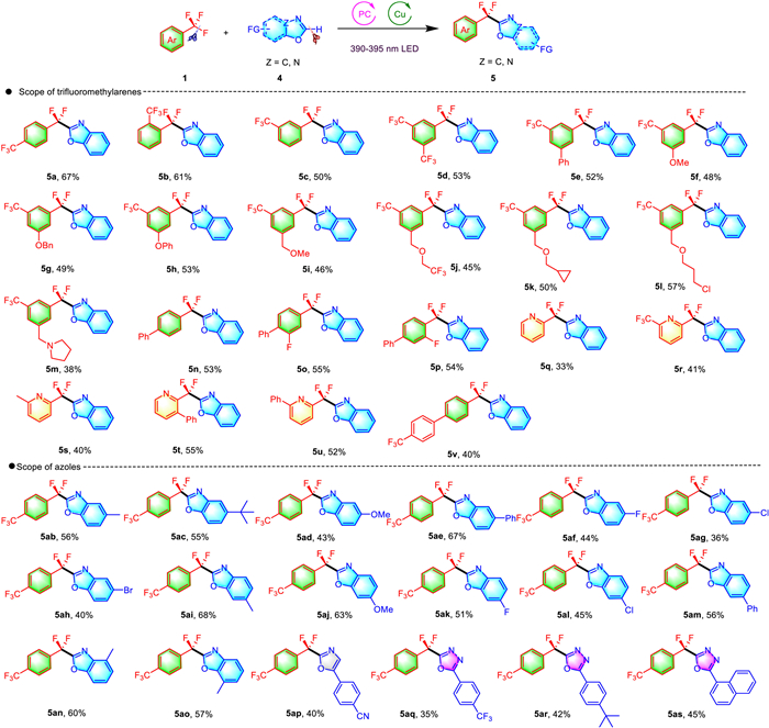 With the optimized conditions in hand, we then explored the scope of this cross-coupling reaction of C(sp3)-F bonds with C(sp2)-H bonds (Scheme 3). Overall, a variety of trifluoromethylarenes (1a-1v) all underwent the defluorinative azolation to yield the corresponding target products (5a-5v) in moderate to good yields by coupling with benzoxazole 4a. For simple arenes substituted by bis-trifluoromethyl or tri-trifluoromethyl (1a-1d), the desired products (5a-5d) can be obtained in good yields (67%, 61%, 50% and 53%, respectively). A range of bis-trifluoromethyl substituted arenes bearing different functional groups, such as phenyl (1e), methoxyl (1f, 1i), benzyloxy (1g), phenoxy (1h), trifluororoethoxy (1j), cyclopropyl (1k), alkyl chloride (1l), and N-substituted tertiary amine (1m), were also compatible with the standard conditions affording the defluoroazolation products (5e-5m) in moderate to good yields (38%−53%). Encouraged by the above results, we next tried our approach with mono-trifluoromethyl substituted arenes. Not surprisingly, for 4-aryl substituted trifluoromethylbenzene (1n, 1v), the target products (5n, 5v) were obtained in yields of 53% and 40%, respectively. In addition, 4-aryl substituted trifluoromethylbenzene with fluorine (1o, 1p) were also tolerated and smoothly converted to the desired products (5o, 5p) in reasonable yields (55% and 54%, respectively). Futhermore, heteroaryl substrates such as mono- or bis-trifluoromethyl substituted pyridines (1q-1u) were also amenable to this defluorinative azolation protocol with moderate to good level of efficiency (5q-5u, 33%−55%).