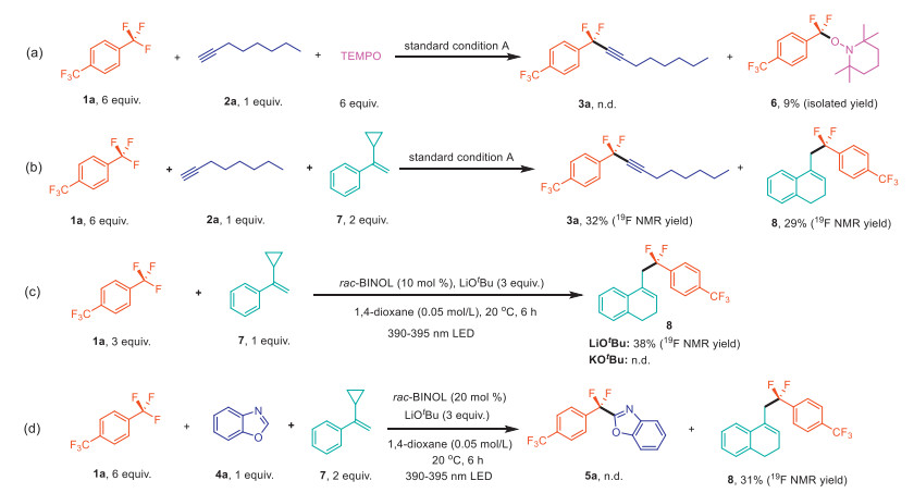 In order to get insight into the reaction mechanism, a few experiments were carried out next (Scheme 4). First, we performed radical trapping experiments to prove whether the reaction involves a radical process. Under the standard conditions A, when a radical scavenger 2,2,6,6-tetramethyl-1-piperidinyloxy (TEMPO) was added to the model reaction, the desired reaction was completely suppressed and TEMPO-trapped difluorobenzylic radical adduct 6 was observed and successfully isolated in 9% yield (Scheme 4a). In addition, a radical clock experiment by using (1-cyclopropylvinyl)benzene 7 as a probe was carried out under the standard conditions A. We found that the desired product 3a was formed in 32% 19F NMR yield and a radical ring-opening product 8 was also detected in 29% 19F NMR yield (Scheme 4b). These results strongly support that a difluororobenzylic radical is involved in the reaction and the formation of 3a is slightly more favorable in Scheme 4b. Next, to investigate the catalytic effect of BINOL anion, a few control experiments were conducted. Based on the standard conditions, when (1-cyclopropylvinyl)benzene 7 was added to the reaction system in the absence of copper salt, ligand L1, LiOAc and substrate 2a, it was found that the radical ring-opening product 8 was observed in 38% 19F NMR yield (Scheme 4c). However, when the above experiment was performed with KOtBu instead of LiOtBu, no radical trapping product 8 was detected. Additionally, when the reaction was conducted in the presence of (1-cyclopropylvinyl)benzene 7 without copper salt, ligand L1 and LiOAc, and as expected, the target product 5a was not detected and the radical ring-opening product 8 was obtained in 31% 19F NMR yield (Scheme 4d). Besides, using (1-cyclopropylvinyl)benzene 7 as a probe again, radical trapping product 8 was also not detected in the absence of BINOL (see Supporting information).