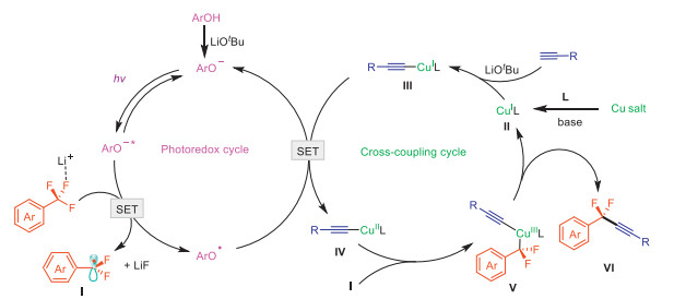 Based on the above experimental results and related literatures [60-64,70-73], we proposed a plausible reaction mechanism for these photoredox and Cu/L dual catalysis process taking defluoroalkynylation as an example (Scheme 5). The whole process incorporates a photoredox cycle and a Cu catalyzed cross-coupling cycle. In the presence of LiOtBu, BINOL can be deprotonated to form anion ArO–, which can reach an excited state ArO–* under 390–395 nm light irradiation. Then, ArO–* reduces trifluoromethylarenes 1 via single electron transfer in the presence of Li+ to generate difluorobenzylic radical Ⅰ, LiF and radical species ArO•. At the same time, CuⅠL complex Ⅱ undergoes transmetallation with terminal alkynes to form alkyne-CuⅠL complex Ⅲ, which is then oxidized by ArO• to generate alkyne-CuⅡL Ⅳ accompanied by regeneration of ground state ArO–. Difluorobenzylic radical Ⅰ is then captured by intermediate alkyne-CuⅡL Ⅳ to give alkyne-CuⅢL Ⅴ. Eventually, alkyne-CuⅢL Ⅴ undergoes reductive elimination to generate final defluoroalkynylation products Ⅵ with regeneration of CuⅠL complex Ⅱ to complete the catalytic cycle.