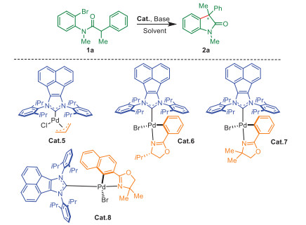 The comparison of Cat.1 with Cat. 5 (99% vs. 47%) further indicated its higher catalytic ability. Notably, the best catalyst Cat.6 used in our previously developed intramolecular α-arylation (98%, at 110 ℃) [42], as well as other rationally designed AnIPr-derived palladacycles all gave lower yields (Cat.6–8, 42%–51%). Importantly, all IPC-Pdallyl catalysts (Cat.1–4, 56%–99%) exhibited higher catalytic performances than those of AnIPr-Pd complexes (Cat.5–Cat.8, 42%–51%), indicating the key role of electronic property of IPC ligand in dictating the excellent activity of Cat.1. To put it briefly, Cat.1 bearing Tripp and bornyl units was proved to be the best catalyst at lower reaction temperature due to the matched electronic and steric properties.