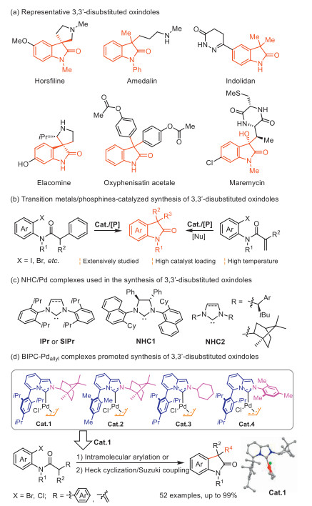 3,3′-Disubstituted oxindoles, as the privileged heterocyclic framework, are widely present in natural products and bioactive pharmaceuticals (Scheme 1a) [1-7]. In the past decades, a great effort has been devoted to their catalytic synthesis, and among them, transition metal-catalyzed α-arylation and Heck cyclization/sequential coupling reactions have constituted one of the most practical methods [8-16]. Since the seminal contributions from Grigg [17,18], diverse sophisticated phosphorous ligands were designed to promote these reactions (Scheme 1b) [10-12]. Though good enantioselectivity was achieved, some limitations still remain, which remarkedly hampered their potential practical applicability. One of them is the high loading of Pd center (5–10 mmol%) and phosphines (10–20 mmol%), which seriously increased the economic cost. Additionally, most of the highly active phosphines are air-sensitive. Another limitation is that high temperature (mostly > 100 ℃) was always required. Consequently, the development of alternative approaches to access 3,3′-disubstituted oxindoles by using new ligands at milder reaction conditions is of great importance.