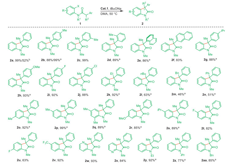 Subsequently, we investigated the scope of N-(2-bromophenyl)-N-substituted-2-phenylpropanamides. As depicted in Scheme 2, amides with diverse functional groups were rapidly converted into desired 3,3′-disubstituted oxindoles in good to excellent yields (63%–99%). The relative position of substituents in the phenyl moiety at α-carbon (α-Ph) of the carbonyl group greatly affected the efficiency at 50 ℃: meta-substrate showed a better yield than ortho- and para-isomers (2c vs. 2b and 2d, 99% vs. 88% and 20%, respectively). Increasing the reaction temperature to 90 ℃ could also result in a good yield of ortho-product (2d, 89%). The steric effect was also observed in the case of naphthylpropanamides (2e and 2f, 86% and 83%, respectively). A higher activity was obtained for α-Ph with electron-withdrawing groups (F, Cl) than those with electron-donating groups (iPr, OMe), all leading to good yields (2g–2j, 88%–93%). Furthermore, the variation of R2 substituents such as Me, Et, nBu and Bn as well as aromatic one of Ph were tested. All of them were compatible in the intramolecular α-arylation (2k–2n, 46%–92%), though the steric bulky affected the coupling efficiency (92% and 99% for 2a and 2k vs. 2l–2n, 46%–63%). Unfortunately, alkyl R2 with heteroatoms such as O and N were not tested due the failed synthesis of relevant substrates. The aniline moiety showed a slight positional effect (2o–2q, 89%–99%), while a similar electronic effect was found that the efficient conversion of anilines bearing electron-donating groups into products required a higher reaction temperature than those with electron-withdrawing groups (2o-2s, 85%−99% at 100 ℃ vs. 2r-2v, 63%−92% at 50 ℃). Heterocyclic rings of pyridine (2w and 2x, 93% and 84%) and other N-substitutions such as Et, iPr and Bn (2y–2aa) were well tolerated (77%–93%). Additionally, product 2a could also be formed from the inactive chloro–analog of 1b in a moderate yield (52%), further indicating the high activity of Cat.1.