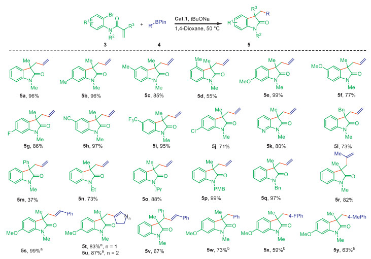| Scheme 3. Substrate scope for the intramolecular Heck cyclization/Suzuki coupling. Standard conditions: 3 (0.4 mmol), 4 (0.8 mmol), Cat.1 (2 mol%), tBuONa (0.48 mmol), 1,4-dioxane (6 mL), 50 ℃, 24 h. Isolated yield. a 70 ℃. b 100 ℃. PMB = p-methoxybenzyl. | |
