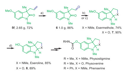 The applicability of this catalytic protocol was examined in the concise synthesis of heterocycle-fused indoline alkaloids, as depicted in Scheme 4. First, it could easily be scaled up to 16 mmol leading to 2.65 g of 5f in a 72% yield. Second, the formation of 3-formyloxindoles (6, 1.0 g, 86%) from 5f was achieved in good yield using the combined catalytic system of K2OsO4·2H2O, N-methylmorpholine-n-oxide (NMO) and NaIO4, which served as a key precursor for the synthesis of bioactive natural products (±)-desoxynoreseroline, (±)-esermethole and their derivatives such as (±)-physostigmine and (±)-phenserine. The racemic esermethole was successfully obtained in a 74% yield by using a reductive amination and condensation cascade one-pot process. The deprotection of the OMe group at esermethole by using BBr3 led to the generation of (±)-eseroline in 85% yield. Additionally, the O-congener (7) of (±)-esermethole was obtained in excellent yield (90%), and the subsequent deprotection led to 8 in 89% yield, which was the key intermediate of (±)-physovenine.