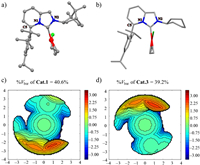 | Fig. 2. (a) Crystal structure of Cat.1 (the ellipsoid contour at 50% probability levels), (b) the simulated structure of Cat.3, %Vbur and steric maps of (c) Cat.1 and (d) Cat.3. | |