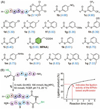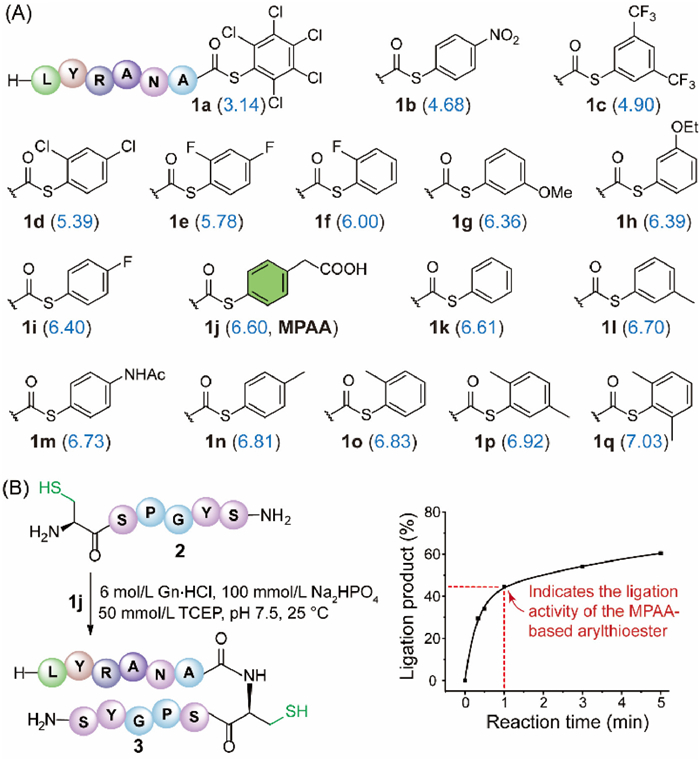 | Fig. 1. Assessment of the ligation activity of arylthioesters. (A) Structures of 17 representative arylthioesters, with the pKa values of their corresponding arylthiols shown in blue within parentheses. (B) Illustration of the method for evaluating the ligation activity of arylthioesters. | |