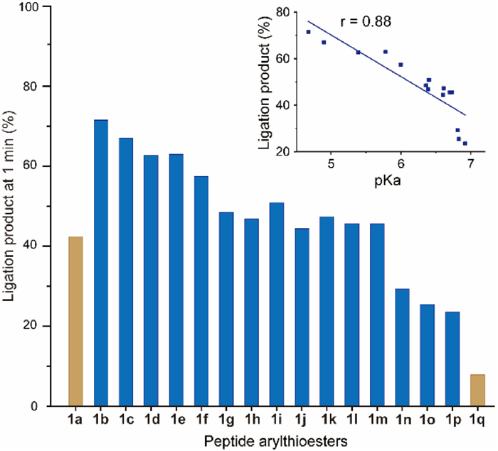 Specifically, the peptide arylthioester 1b, derived from 4-nitro-thiophenol with a pKa value of approximately 4.68, displayed the highest reaction activity. As the pKa values of the arylthiols increased gradually, the corresponding arylthioesters exhibited a gradual decrease in ligation activity. Impressively, our analysis uncovered a strong correlation between the ligation activity of the middle 15 arylthioesters (1b-p) and the pKa values of their corresponding arylthiols, with a Pearson correlation coefficient of 0.88. This finding suggests that the reactivity of arylthioesters in NCL is primarily determined by the pKa values of their corresponding arylthiols. Although some highly reactive arylthioesters may experience minor hydrolysis during the ligation process, the variation in the rate of this side reaction follows a trend similar to that of the ligation rate. Therefore, the primary role of pKa in determining ligation activity is unlikely to be significantly affected by the presence of hydrolysis. The reversed trend observed in the previous study reflects the activity of the arylthiols in the thiol-thioester exchange step, rather than the NCL step.